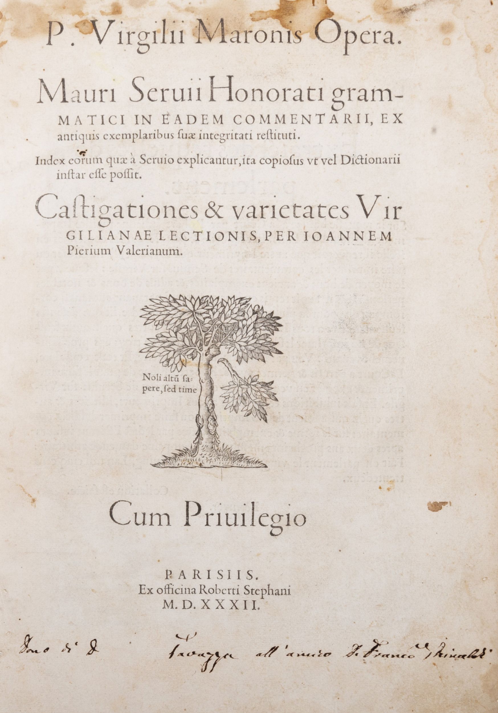Parigi, Robert Estienne, 1532. In 2°. 2 parti in un volume. Marca tipografica al frontespizio, grandi capilettera ornati. Parte seconda con proprio titolo Castigationes et varietates Virgilianae lectionis, Parigi, Robert Estienne, 1539. Al frontespizio grande marca tipografica a piena pagina, spazi per iniziali con letterine guida, macchie e fori di tarlo, su poche carte, qualche alone ed arrossatura, mancante la carta *ii, strappo ad una carta, legatura in piena pergamena del sec. XX.