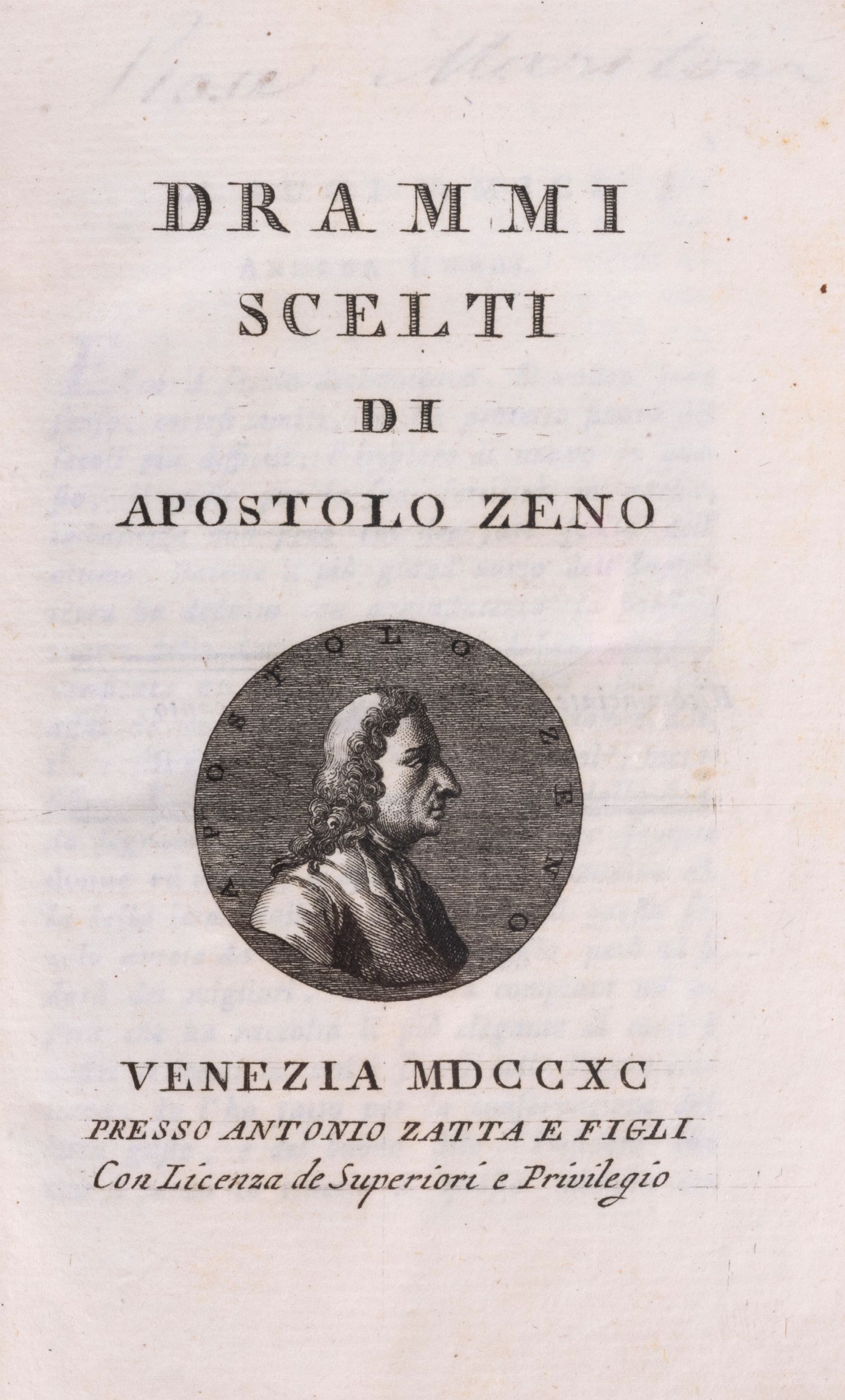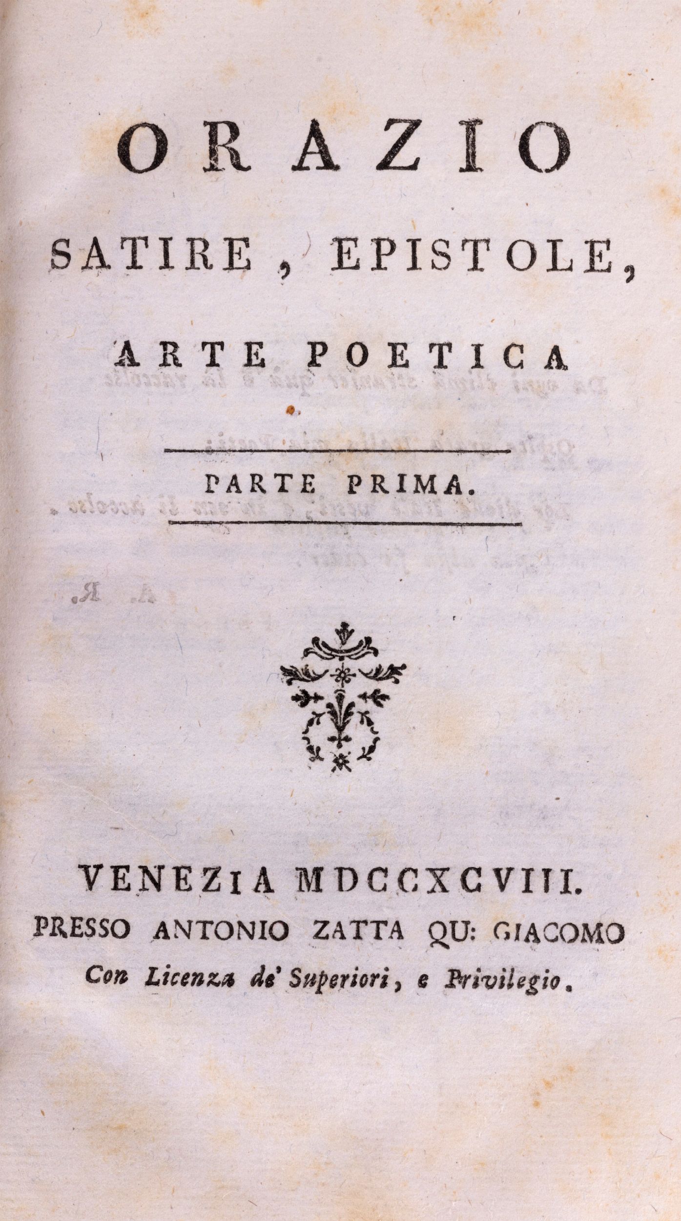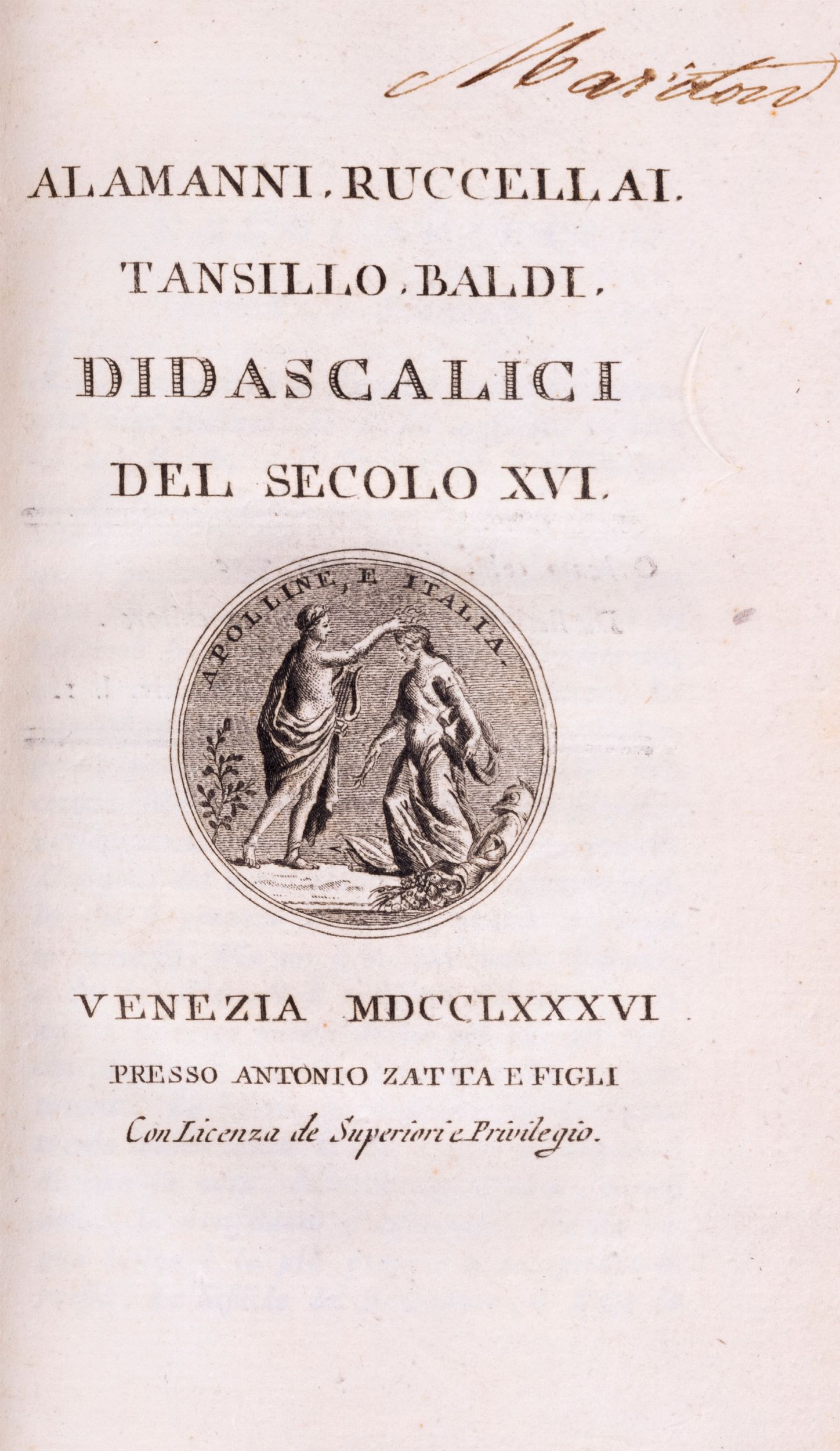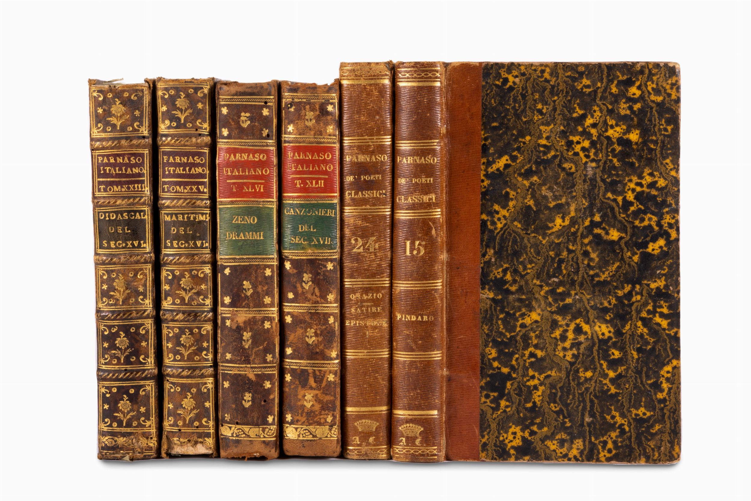 1787 Venezia, Zatta, 1787. In 8°. Solo tomi XXIII Alamanni Ruccellai Tansillo Baldi Didascalici del secolo XVI, Venezia, Zatta, 1786 e XXV Baldi Rota Franco Del Vasto Fidentio Marittimi e Pedanteschi del secolo XVI, Venezia, Zatta, 1787. Vignetta calcografica al frontespizio, testatine incise in rame nel testo, leggera arrossatura ai fascicoli iniziali del vol. XXVI, legatura coeva in pelle marmorizzata, titoli entro doppio tassello al dorso con fregi in oro, tagli marmorizzati. Timbro di appartenenza alla carta di guardia, firma ai frontespizi. § Insieme nel lotto altre edizioni della stessa raccolta: Tomo XV Pindaro di varj autori, Venezia, Zatta, 1795; tomo XLII Canzonieri di Alessandro Guidi e de' De Zappi, Venezia, Zatta, 1789; tomo XLVI Drammi scelti di Apostolo Zeno, Venezia, Zatta, 1790; tomo XXIV Orazio Satire, Epistole, Arte poetica parte prima, Venezia, Zatta, 1798 (leggere fioriture).