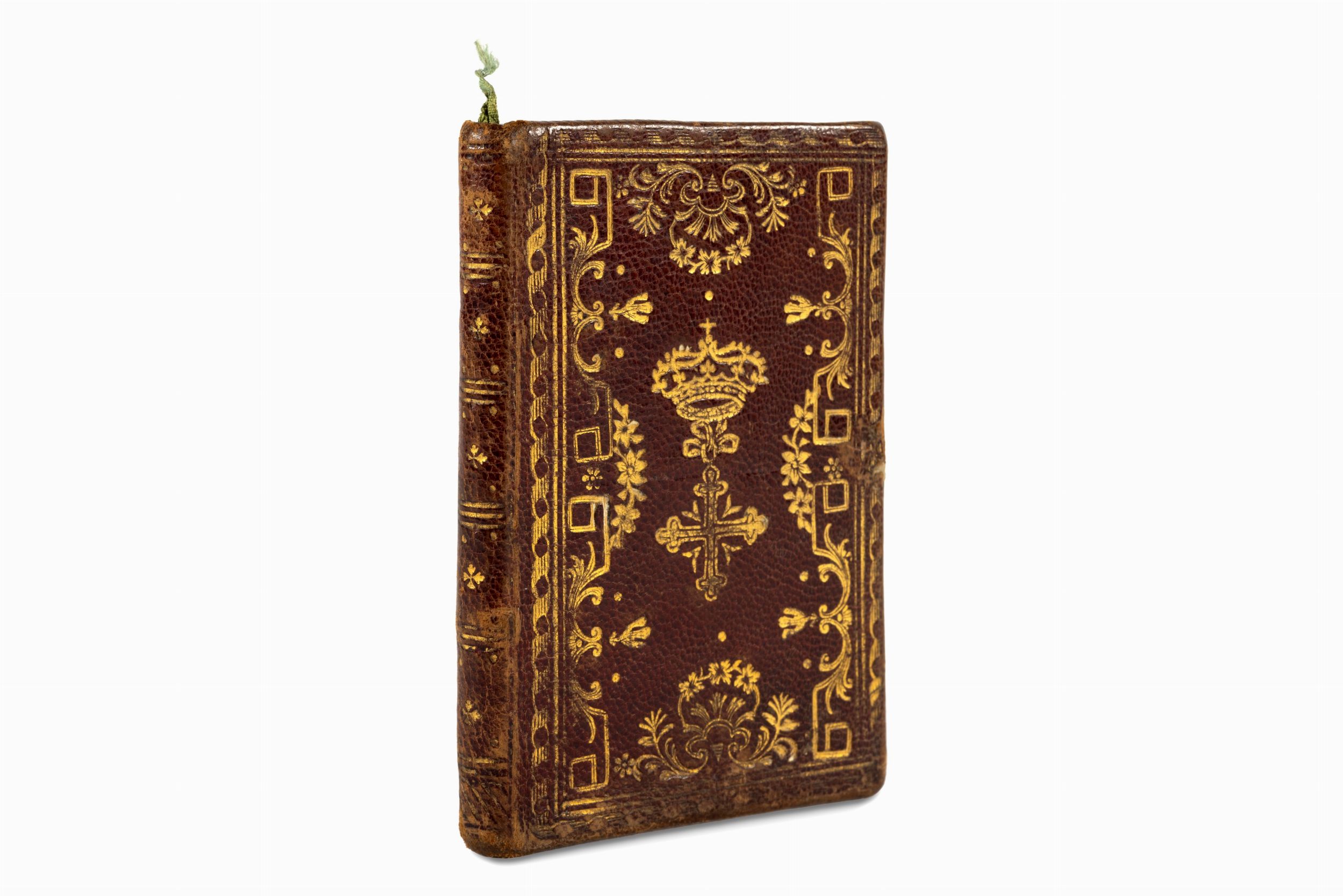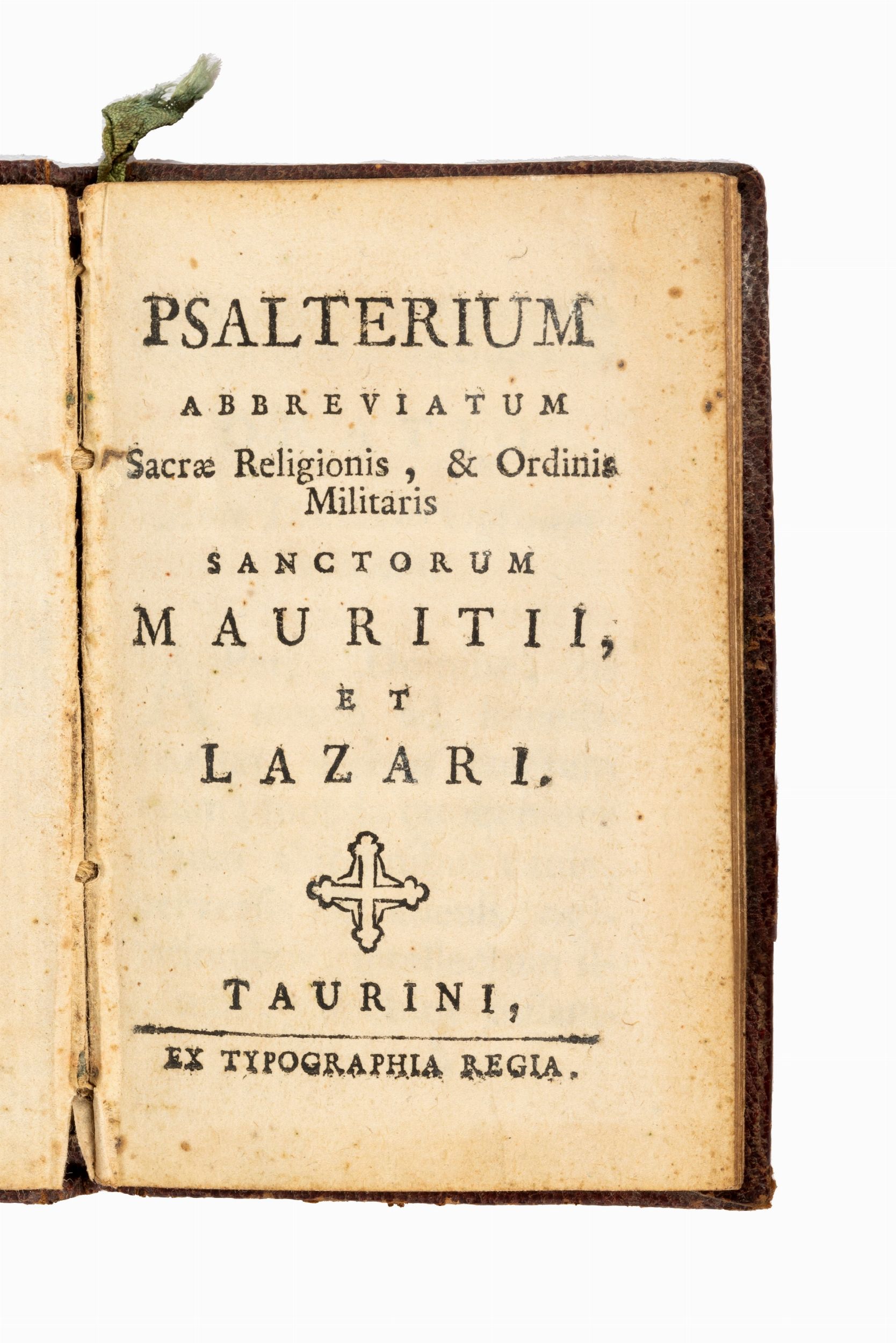 1815 Torino, ex Typographia regia, 1815. In 24°, 95 x 60 mm.. 48 pp. Legatura in marocchino rosso con eleganti decorazioni in oro ai piatti e al dorso, al centro dei piatti le insegne dell'Ordine di San Maurizio e Lazzaro, lacuna vistosa al piatto inferiore, conservato entro elegante custodia in pelle coeva.