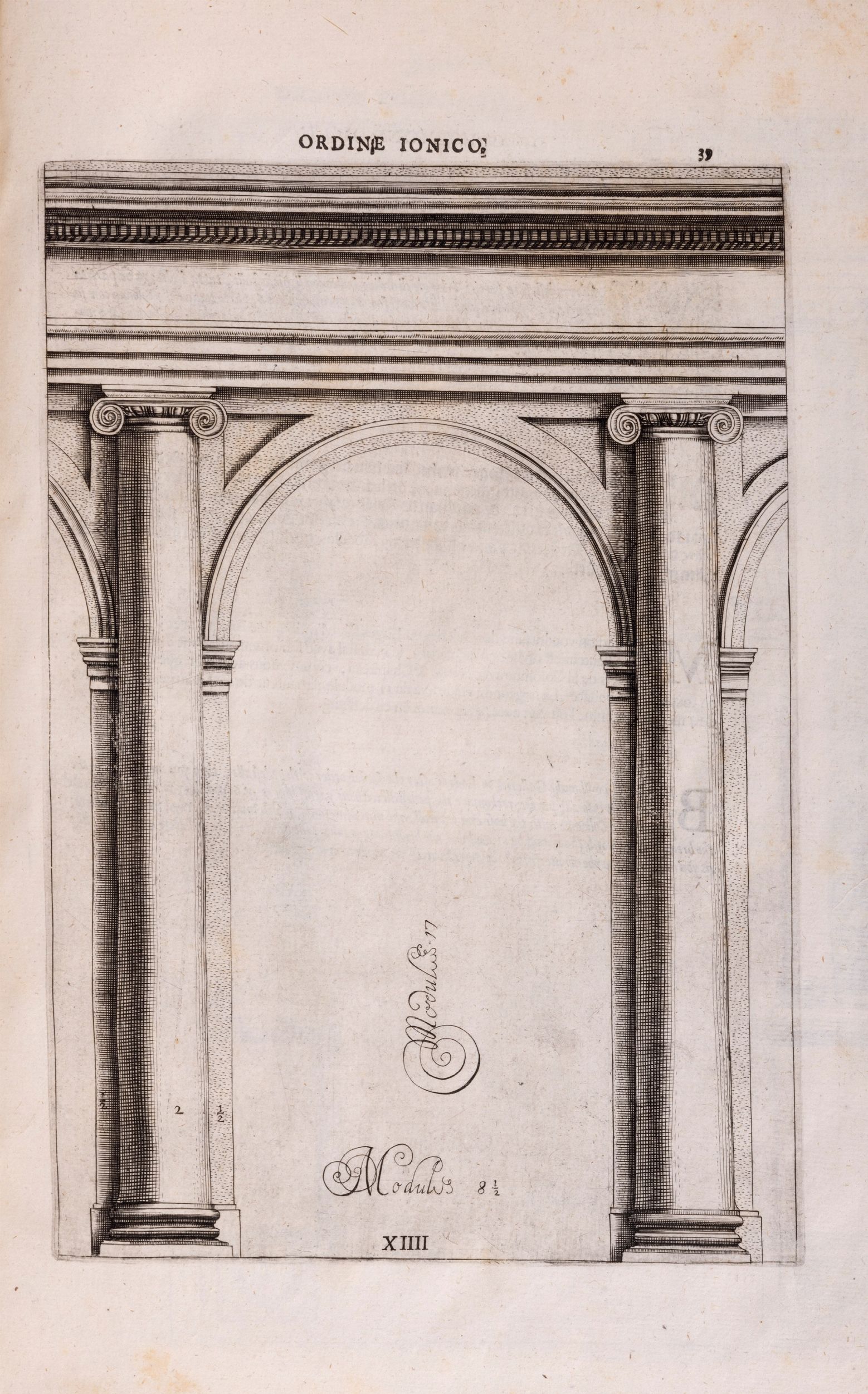 A Utrecht, chez Crispin de Pas, 1629. In Folio, frontespizio, ritratto del Vignola, pp. 95 con 42 tavole a piena pagina, con testo in quattro lingue a fronte, incise su rame, le ultime sette da disegni di Michelangelo. Marca tipografica al frontespizio. Legatura mz. pelle, titolo e fregi in oro al dorso.