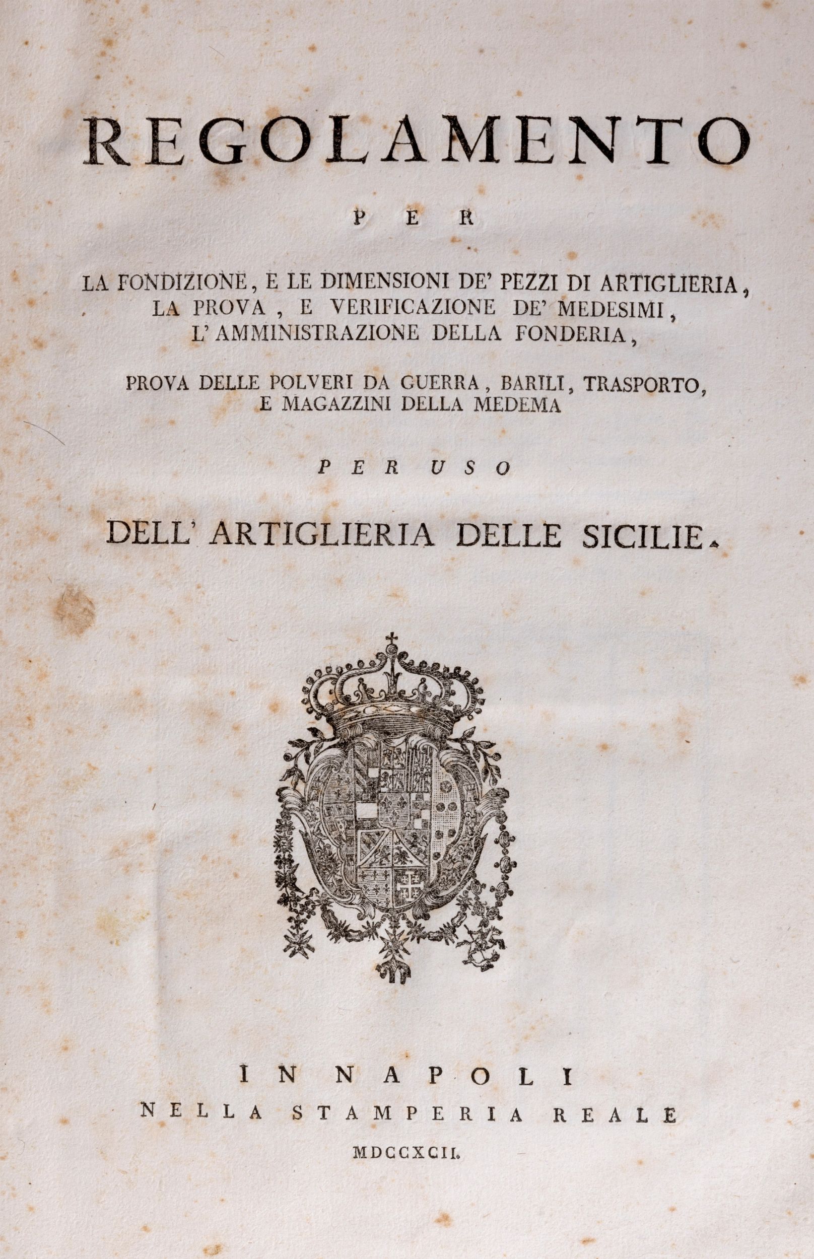 Napoli nella Stamperia Reale, 1792. In Folio, tre parti in un volume ciascuna con proprio frontespizio e con stemma borbonico inciso, pp. 4 -11-(1)-11-(1) con 8 (su 9) grandi tavole ripiegate incise su rame da F. Gionsignani su disegno di di Giuseppe Guerra raffiguranti cannoni, obici e mortali in generale e nei particolari. Legatura coeva mz. pelle, titolo in oro al dorso.