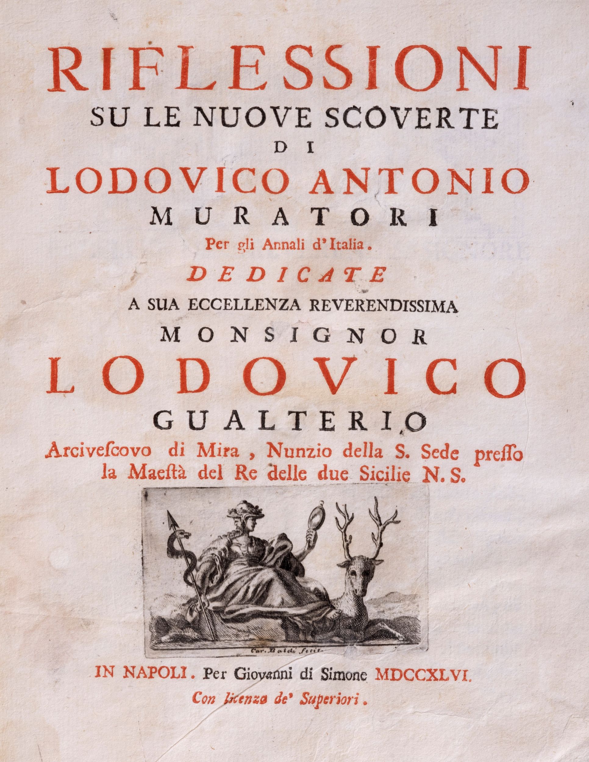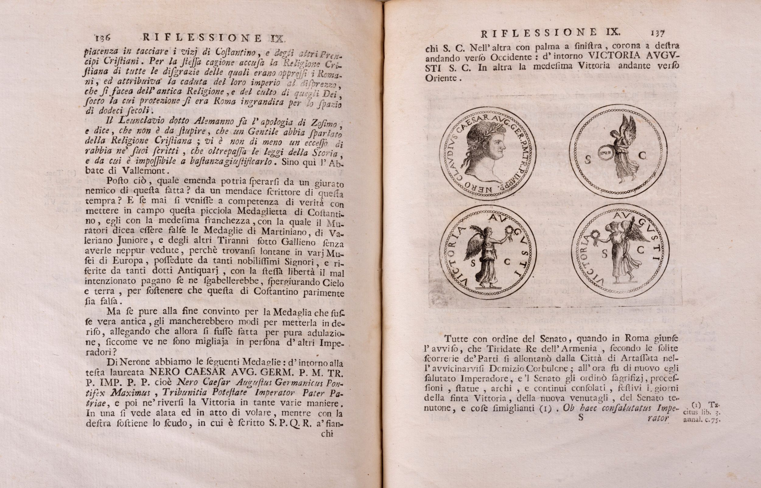 In Napoli, per Giovanni di Simone, 1746. In 4°, front. stampato in rosso e nero, vignetta incisa su rame, pp. (14)-232, testatine e finalini incisi, con molte incisioni nel testo raffiguranti monete. Legatura mz. pergamena, titolo in oro al dorso.