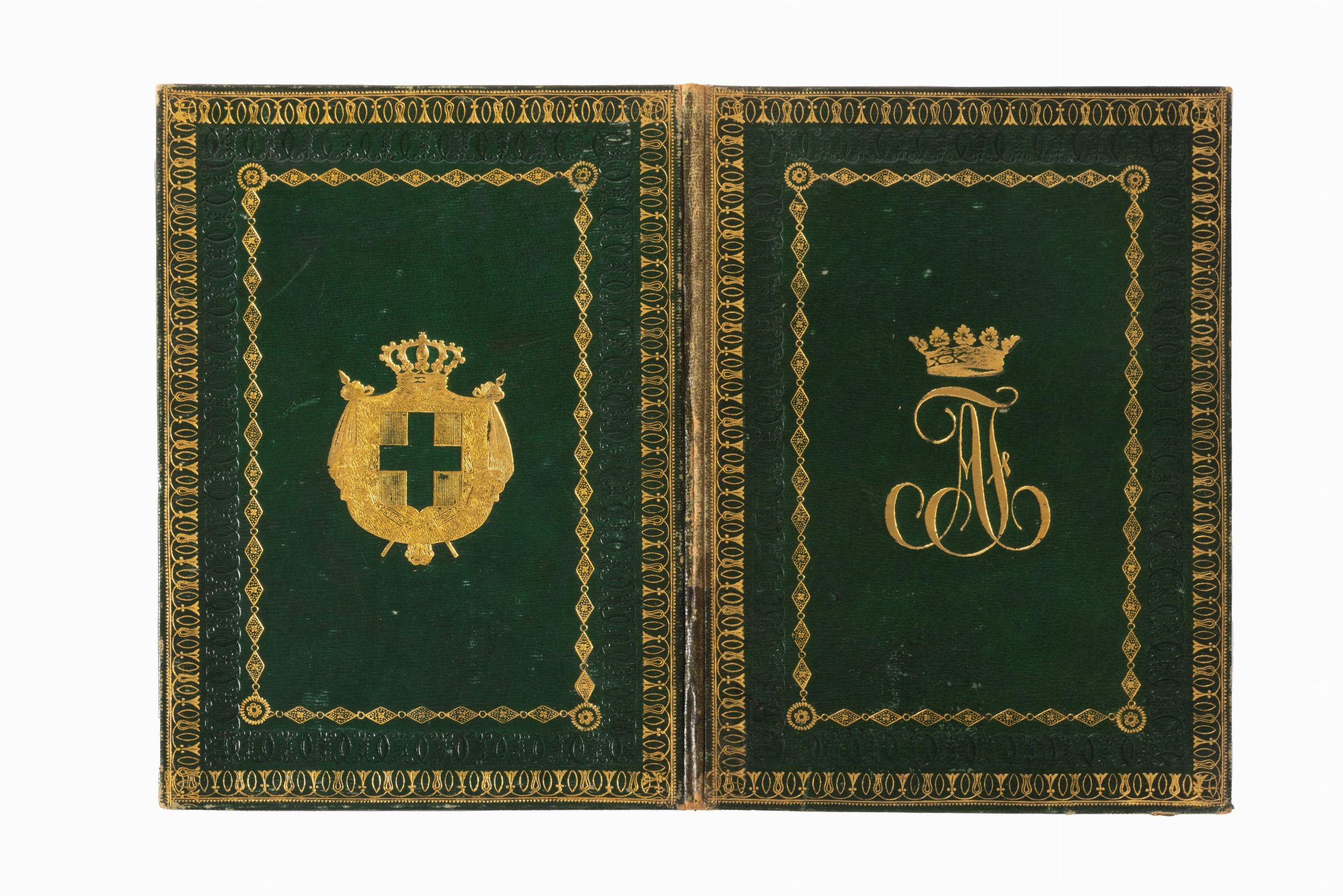 Torino, Giuseppe Fodratti, 1840. In 8 ° grande. Al frontespizio stemma calcografico, con tabelle a piena pagina e ripiegate, legatura in ottavo, in marocchino marrone a grana lunga, decorazione impressa in oro ed a secco, al centro del campo del piatto anteriore le inziali C.A ,tagli dorat́, lievi difetti. Al contropiatto ex libris Biblioteca di S.A..R. / IL Duca di Genova. § Nel lotto un'altra legatura vuota in marocchino verde, rotelle con motivi stilizzati ad inquadrare i piatti, iniziali ducali al piatto anteriore ed al posteriore grande croce sabauda sormontata da corona, decorazione impressa in oro, lievi difetti. Ex libris Biblioteca di S.A..R. / IL Duca di Genova.