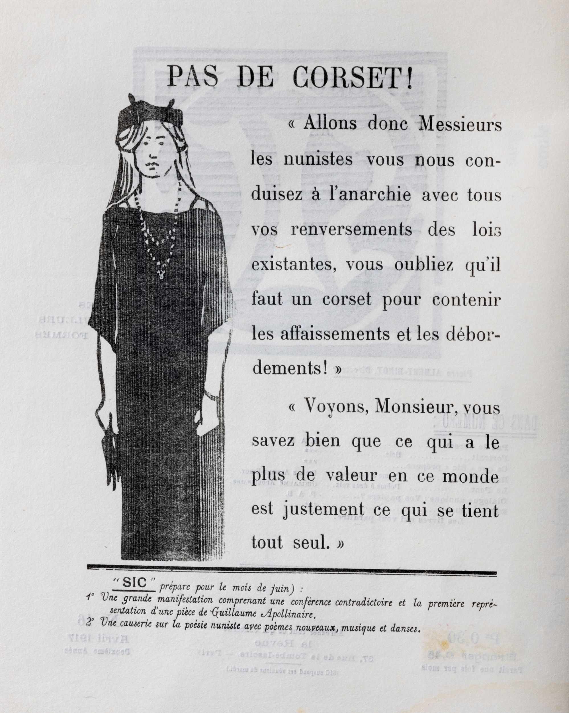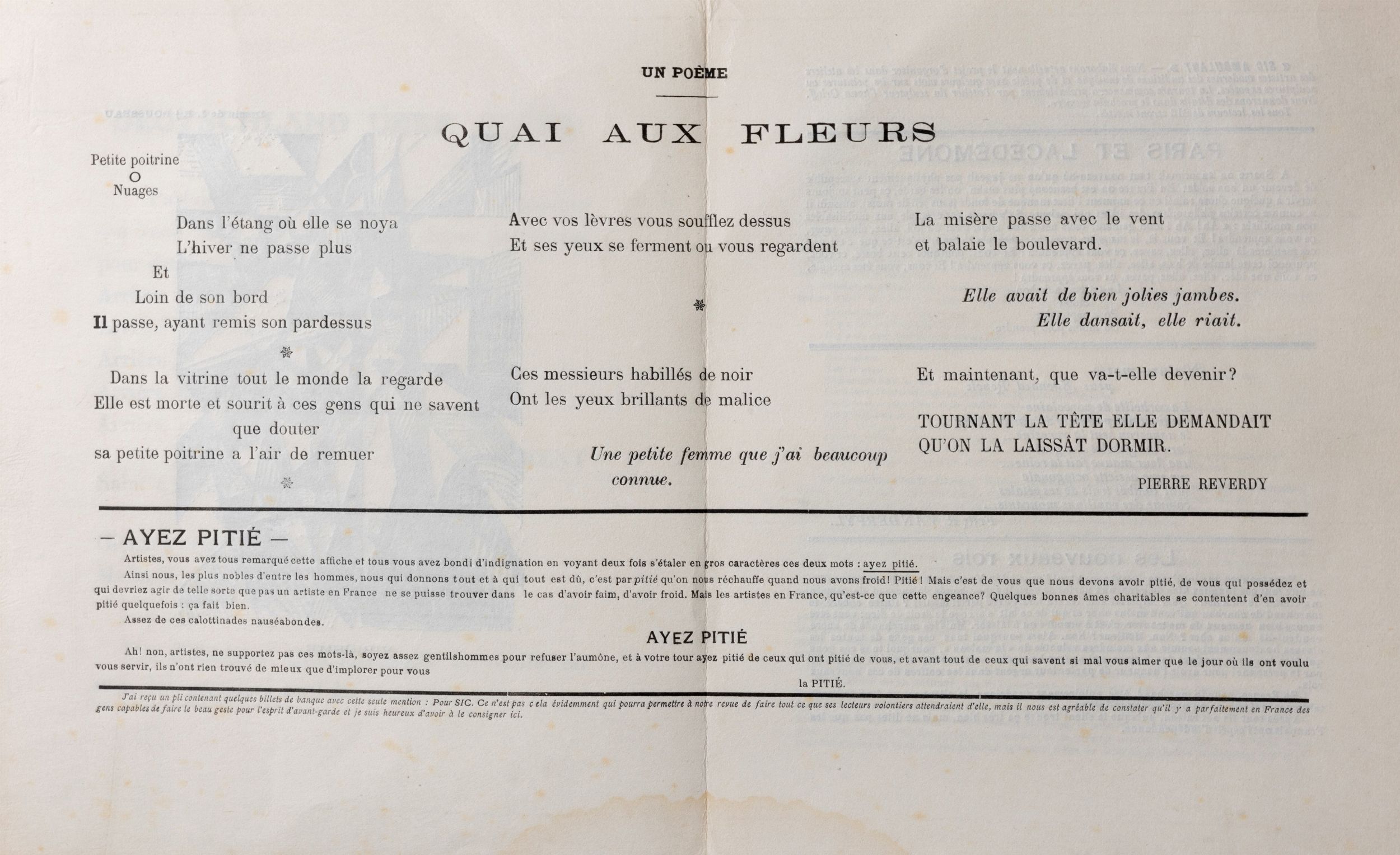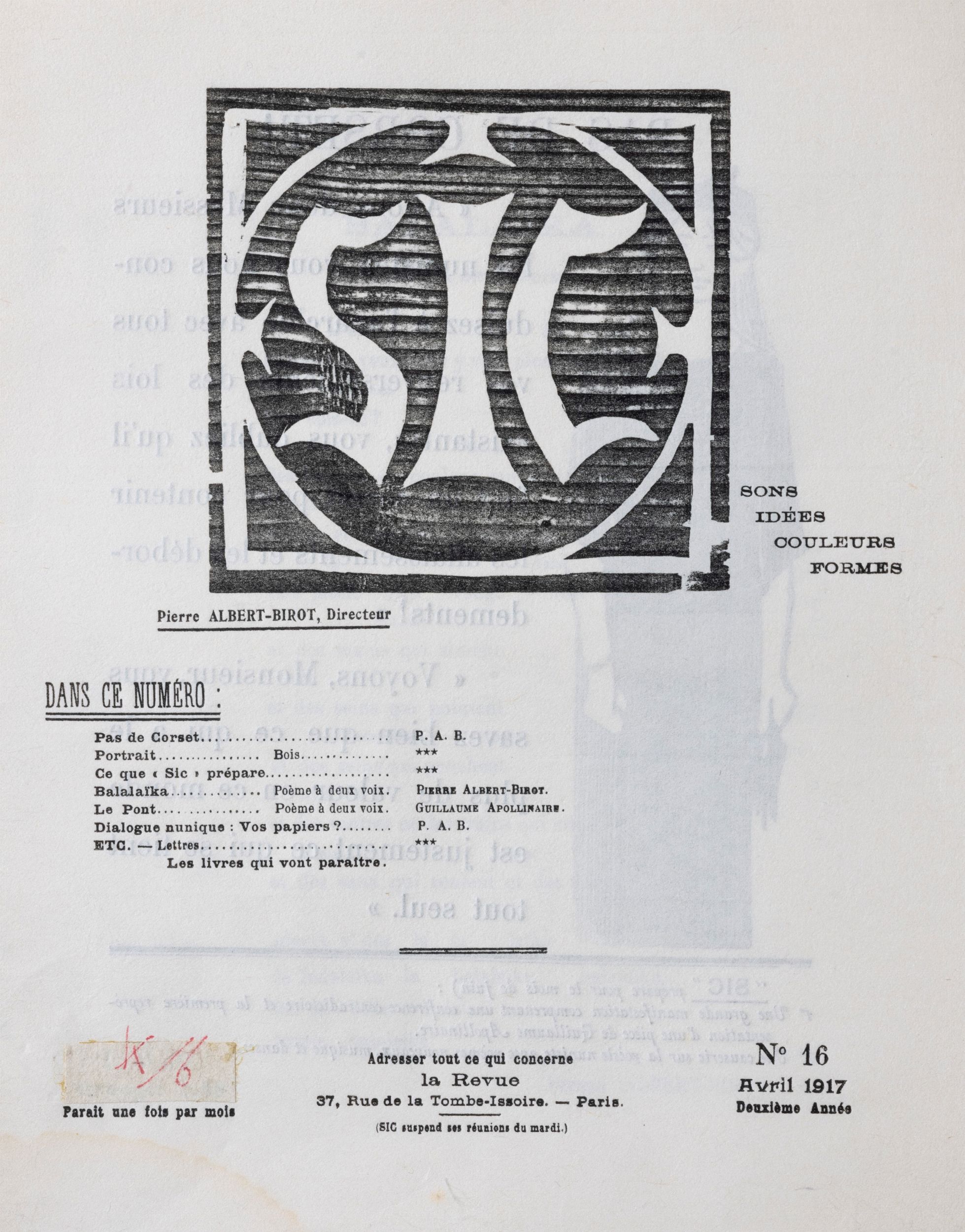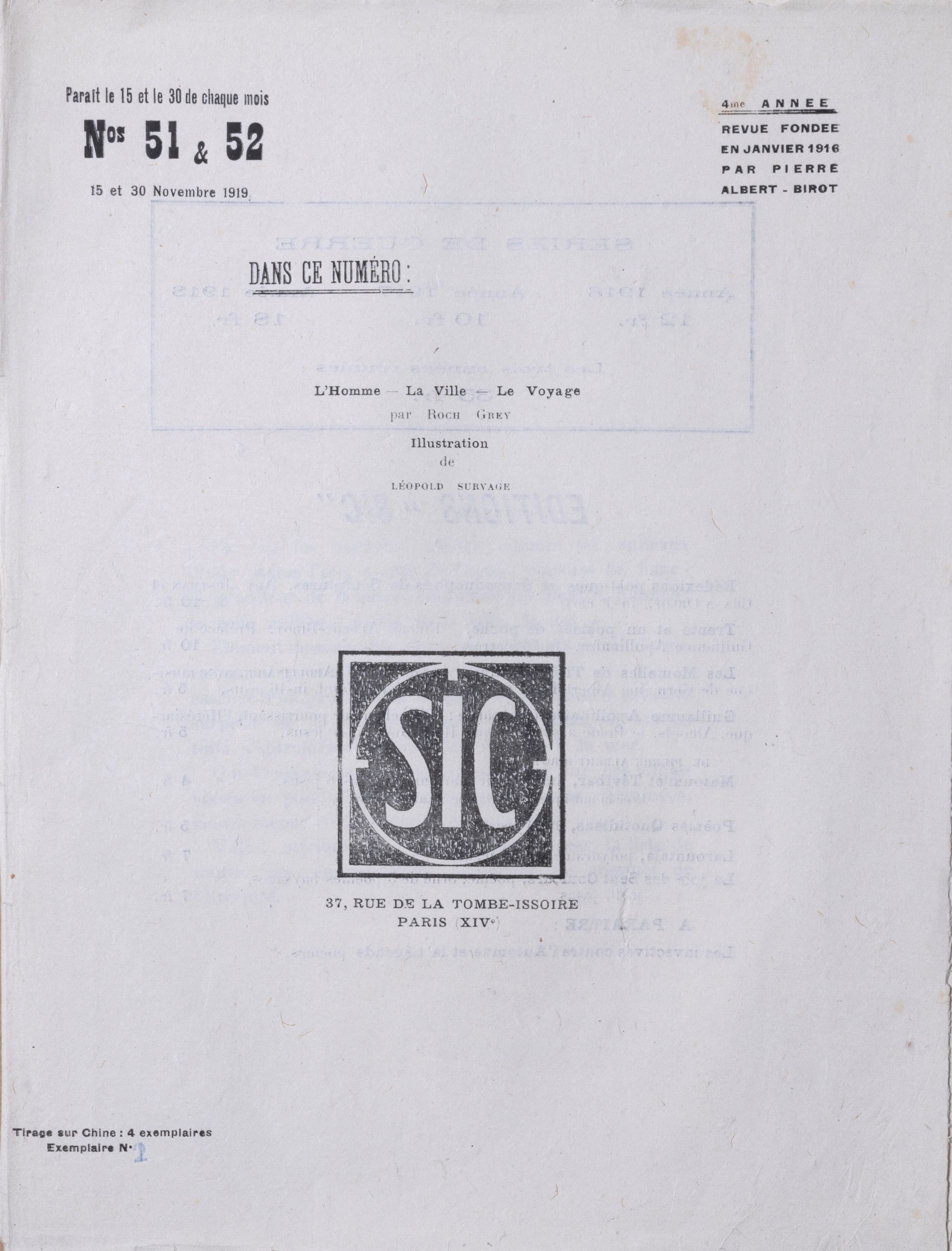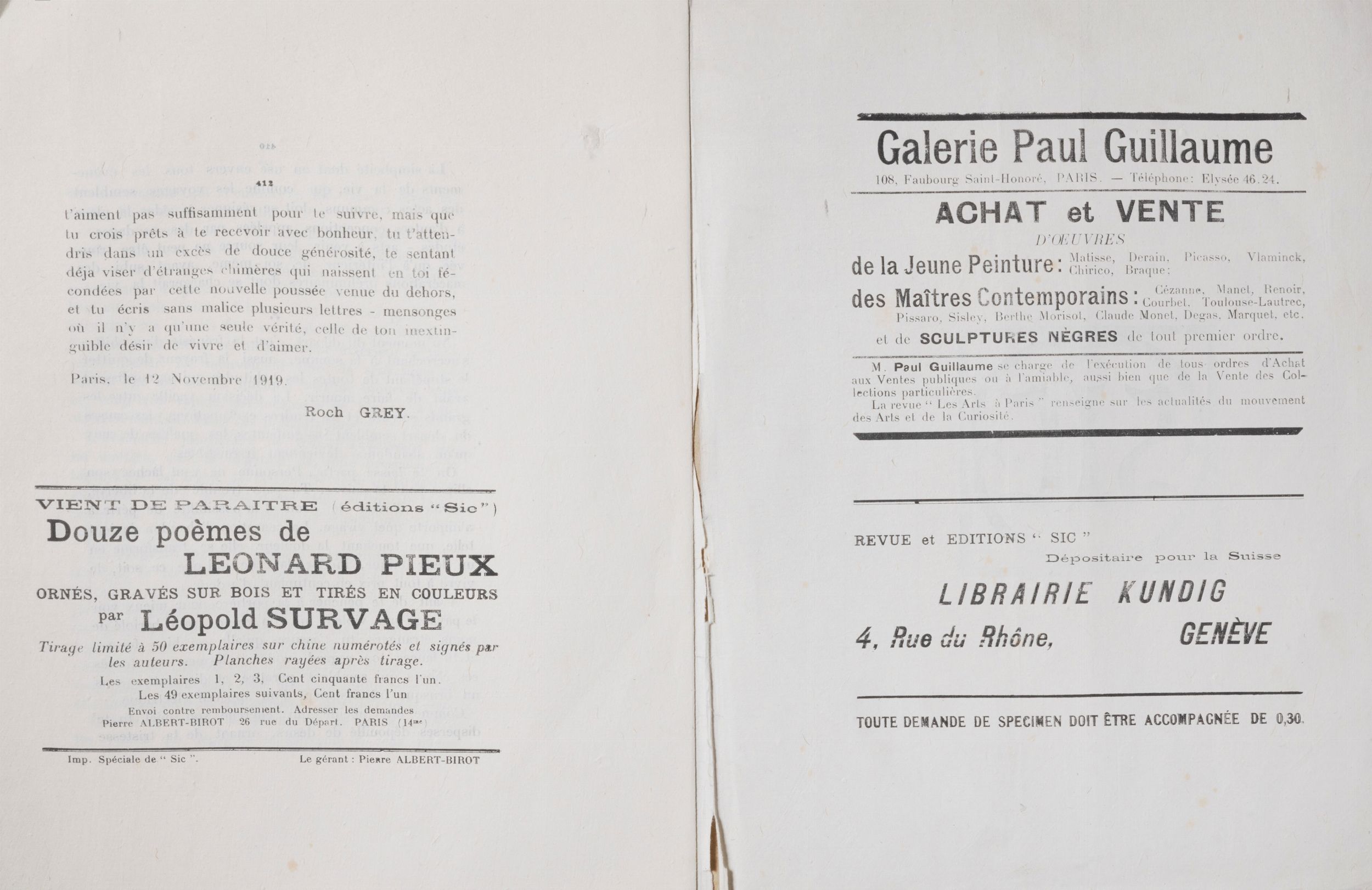 Parigi, da gennaio 1916 a dicembre 1919 (n.1-54). 54 numeri in 41 uscite, la maggior parte in fascicoli sciolti ripiegati, alcuni pinzati e con brossura, numerose tavole in bianco e nero nel testo, il fascicolo numerato 8-9-10 (agosto-settembre-ottobre 1916) contiene una tavola sciolta con disegno originale a colori, il fascicolo numerato 40-41 (febbraio-marzo 1919) contiene una riproduzione fotografica incollata sul foglio di una scultura di Ossip Zadkine, considerata la natura fragile della carta impiegata diversi fascicoli hanno strappi lungo la piegatura e i bordi con rare e piccole mancanze, fascicolo 37-38-39 con uno strappo con mancanza all'angolo esterno inferiore, leggera gora d'acqua su alcuni fascicoli, qualche fioritura e leggera brunitura. Al frontespizio il numero 12 riporta manoscritto a inchiostro rosso 1/10, dal numero 13 al 24 in inchiostro rosso sul frontespizio è segnato 4/6, dal numero 40-41 al 53-54 sul frontespizio la tiratura riporta Tirace sur Chine_ 4 exemplaires. Exemplare n. 2.