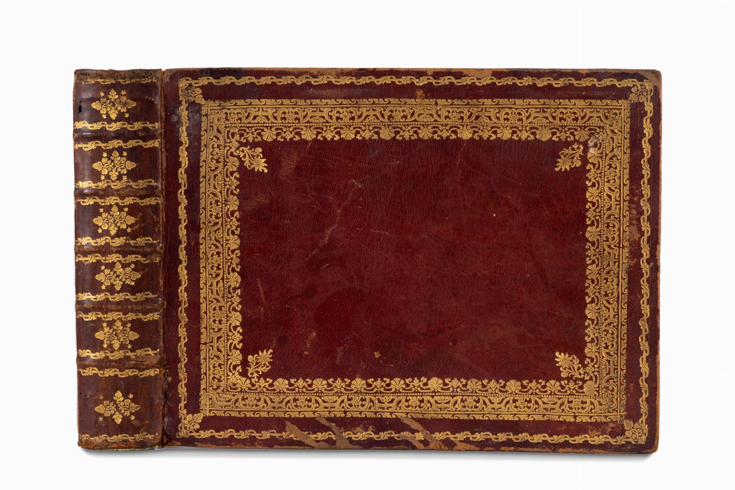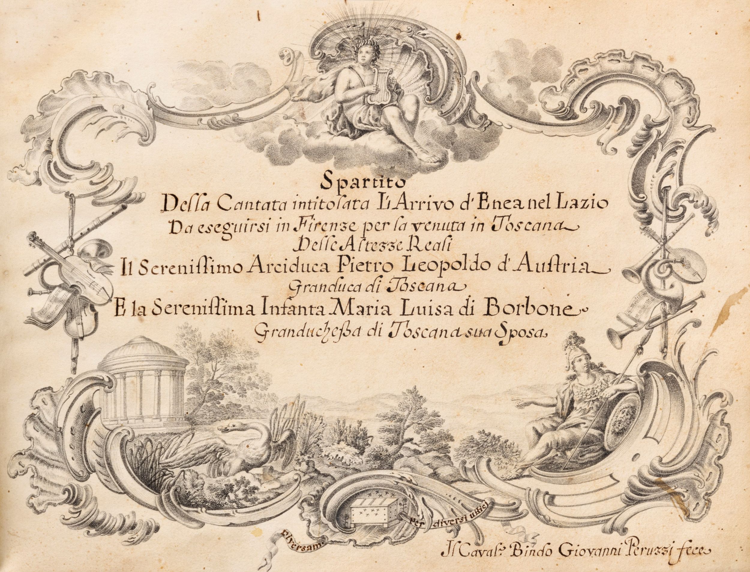 1765 Manoscritto musicale realizzato a Firenze, in 4° oblungo, 198cc., (2c.b.) misure 210 x 275 mm., frontespizio finemente disegnato, titolo calligrafico, legatura in marocchino rosso con doppia cornice di fregi in oro, dorso a sei nervature con fregi, tagli in oro. Nota di possesso alla guardia iniziale Del Conte Piero Pierucci 19 agosto 1753.