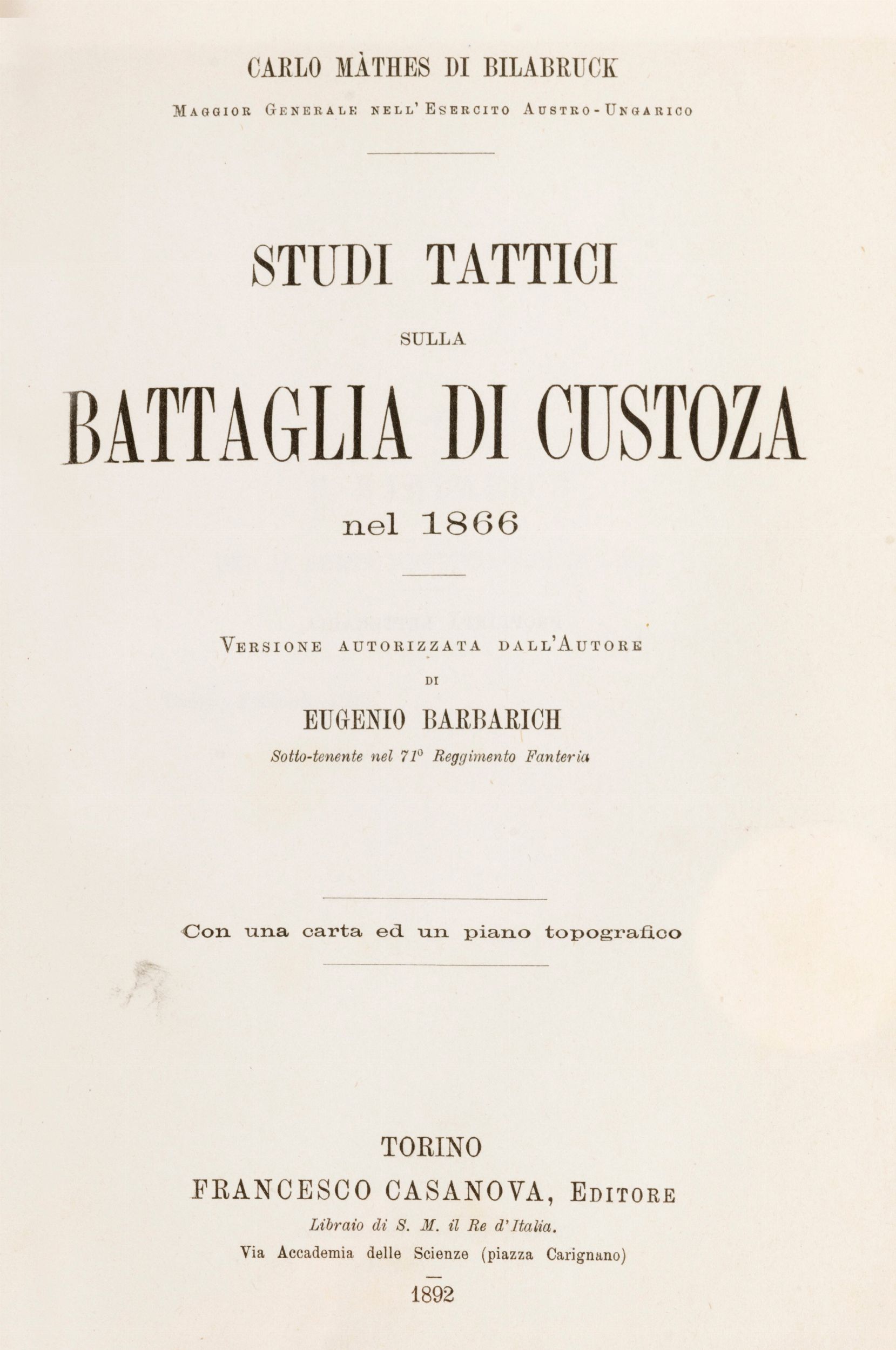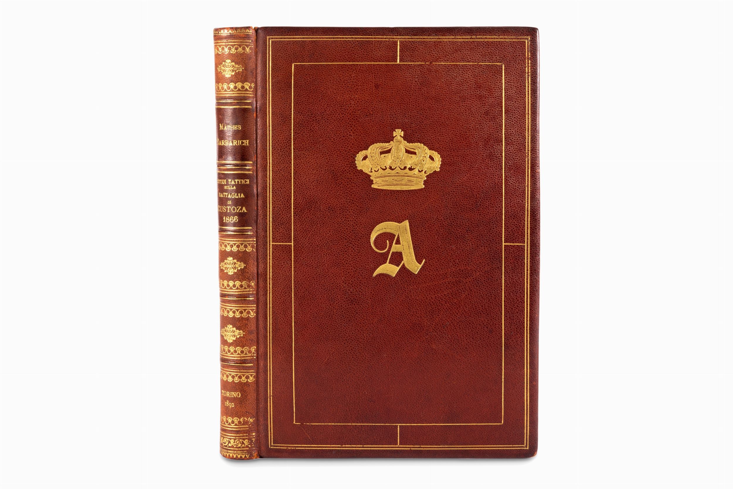 1892 Torino, R. Casanova, 1892. In 8°. In fine volume sono conservate la tavola ed il piano più volte ripiegate inserite in una tasca di seta rossa, legatura in marocchino marrone, con cornici in oro, al centro del campo grande Iniziale A sormontata da corona, al centro del piatto inferiore la data 1866, tagli dorati, lievi graffi, sguardie in raso rosso, larga dentelles di motivi stilizzati impressi in oro.