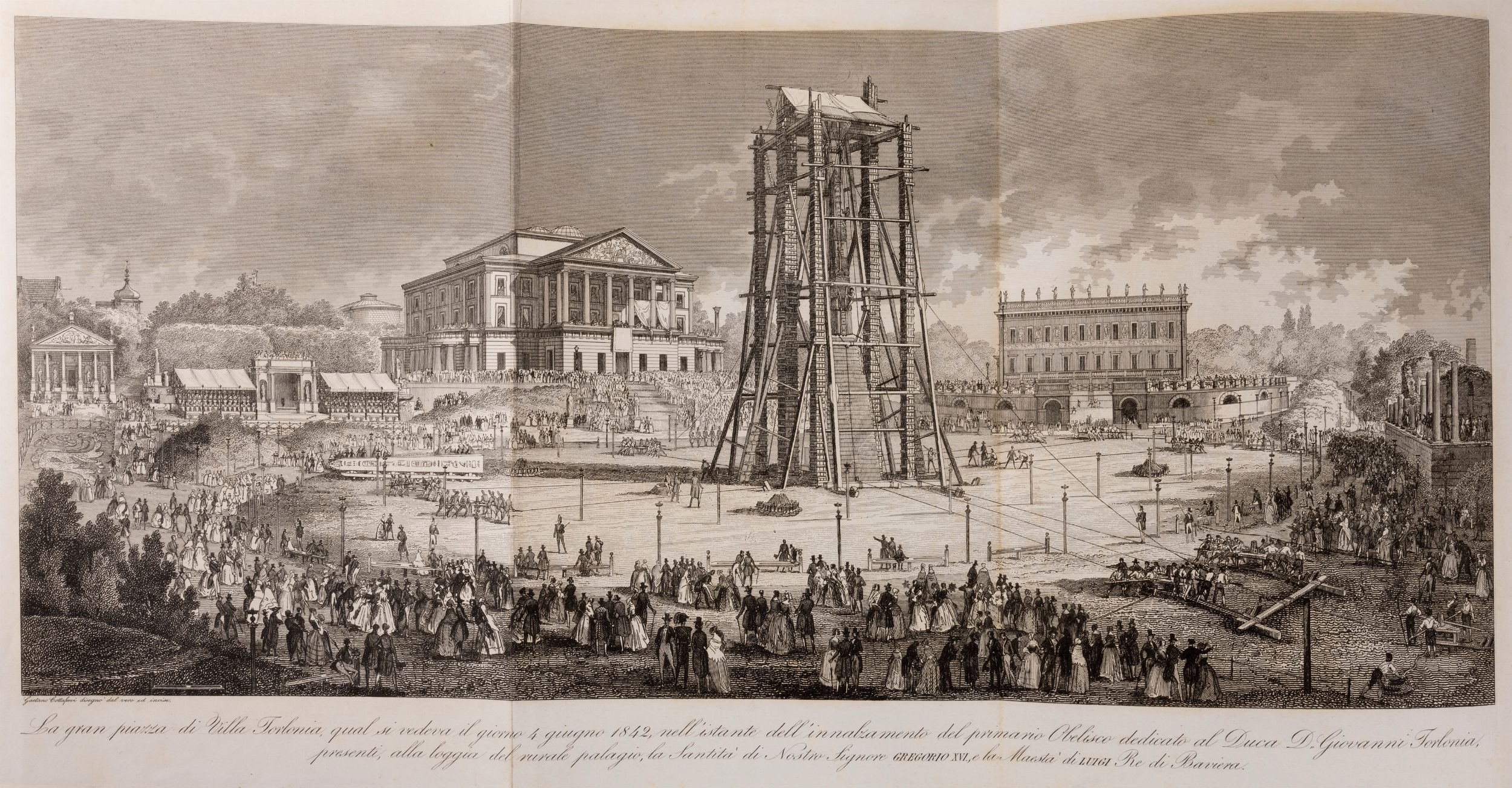 1842 Roma, Tipografia Salviucci, 1842. In 4°. Con 18 tavole incise in rame fuori testo di cui 4 ripiegate, tra queste anche la grande veduta di Villa Torlonia raffigurante l'innalzamento dell'obelisco davanti ad una gran folla di spettatori disegnata ed incisa dal Cottafavi, sporadiche fioriture, veline a protezione delle tavole con arrossatura, elegante legatura editoriale in mezzo marocchino e carta marmorizzata, al centro dei piatti le armi della famiglia Torlonia impresse in oro su intarsio in marocchino, al dorso liscio fregi e titolo, dorso parzialmente staccato, piccole mancanze a cuffia e cerniere, segni di usura.