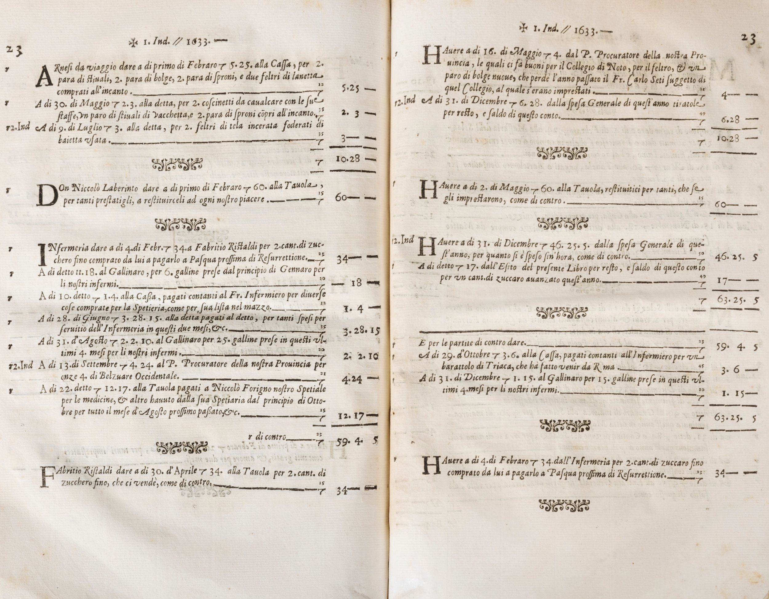 Stampato in Palermo e ristampato in Roma, per il Lazzari Varese, 1677. In Folio, 3 parti in un volume, ciascuna con proprio frontespizio, parte prima: Instruttione del modo, come si devono tenere i libri de' conti…., pp. (4)-126-(2) e due fogli ripiegati: Esempio o paradigma di bilancio..; parte seconda: Esemplare del libro doppio domestico col suo giornale.. per maggior dichiarazione della precedente Instruttione, pp.(3)-32 ma 63 per numerazione delle pagine + 2 bianche; parte terza: Libro maestro, pp. (4)-50 ma 100 per numerazione doppia quali esempi di partita doppia + 7 pagine contenenti Alcune avvertenze intorno al modo di tenere il Libro de' Capitali, il registro e la marca topografica. Ex libris manoscritto. Bruniture uniformi e restauri marginali in alcune pagine. Legatura coeva in piena pergamena, titolo calligrafico.
