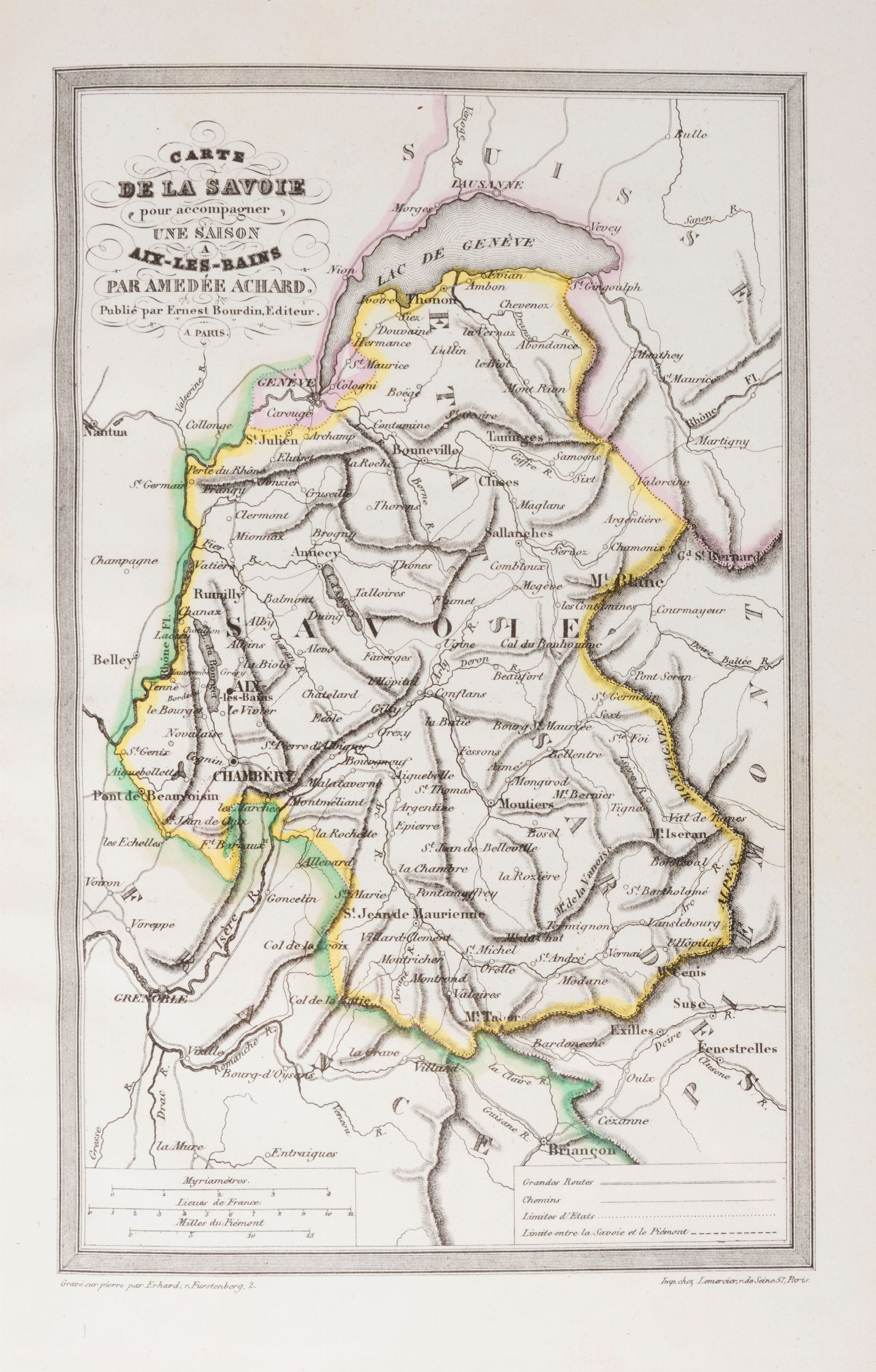 Parigi, Ernest Bourdin, s.d. [ma c.ca 1850]. In 8°. Ritratto di Vittorio Emanuele II in antiporta, vignetta al frontespizio, 16 tavole fuori testo, 12 delle quali raffiguranti vedute di Aix-Les-Bains e della Savoia in generale, e 4 a colori di uniformi militari, testatine calcografiche, qualche arrossatura, legatura editoriale in zigrino, al piatto anteriore stemma dei SAVOIA, dorso completamente decorato, tagli dorati, lievi difetti.