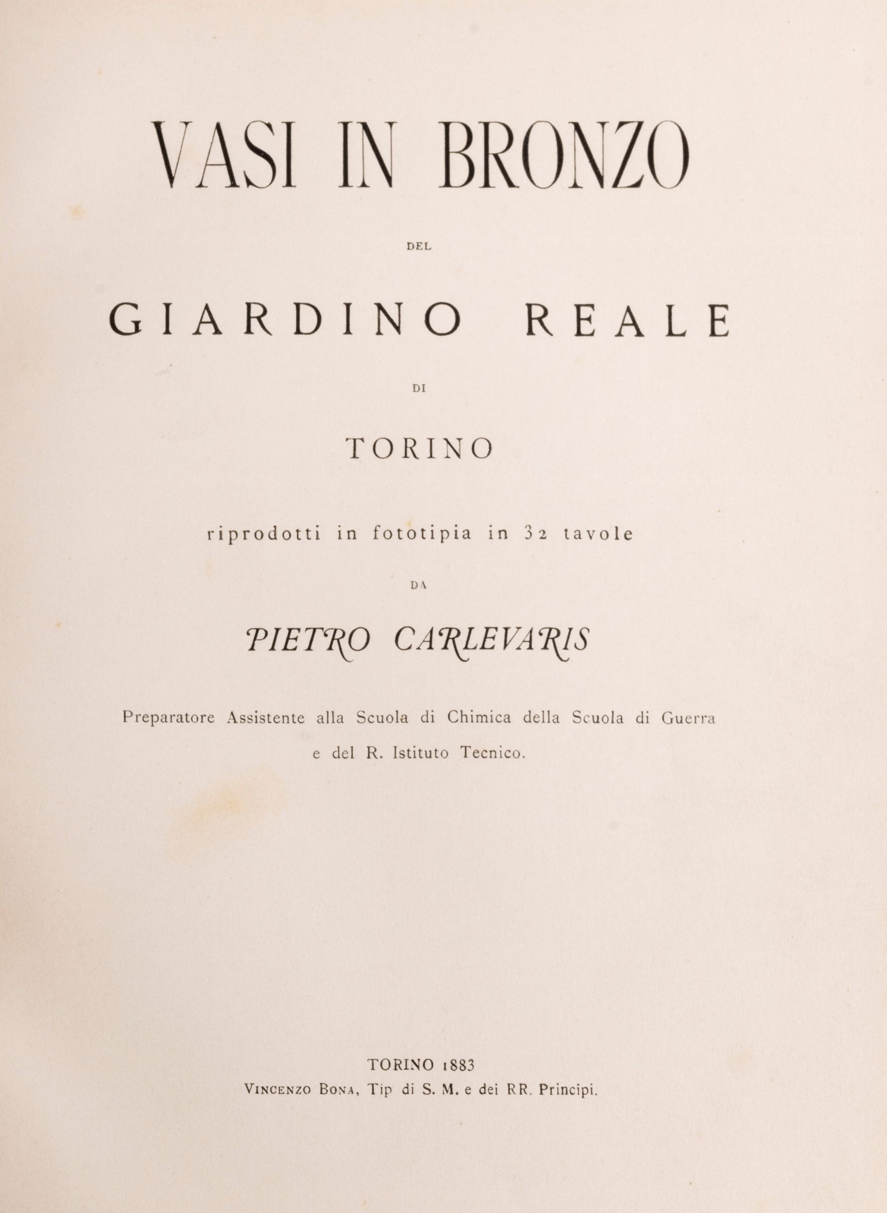 1883 Torino, V. Bona, 1883. In 4°. Due carte di dedica ad Umberto I da parte dell'autore, illustrato da 32 tavole riprodotte in fototipia, ciascuna protetta da velina, timbri editoriali, legatura in marocchino blu, piatti inquadrati da cornice di doppio filetto, dorso a 4 nervi con titolo, decorazione impressa in oro, qualche graffio, leggera perdita di colore al piatto anteriore.