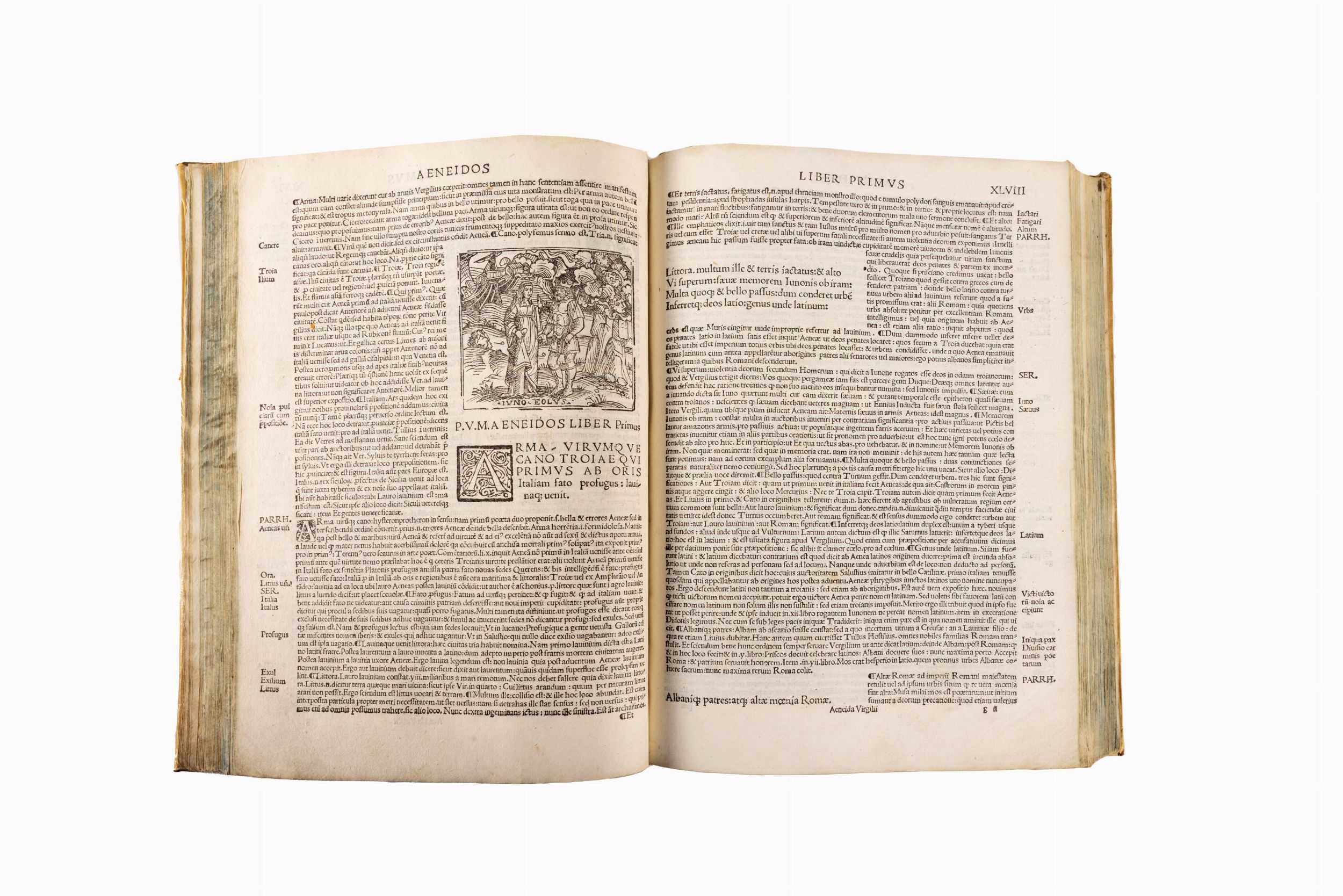 1520 In fine volume Milano, Giovanni Angelo Scinzenzeler, 1520. In 2°. Frontespizio entro elaborata cornice architettonica, numerose e pregevoli xilografie nel testo, capilettera ornati, testo circondato dal commento, foro di tarlo per circa 20 carte che lede la parte stampata, arrossature alle prime ed alle ultime carte, taglio al margine laterale esterno da XLVII a LX, legatura in pergamena del sec. XVIII, al dorso liscio tassello in pelle con autore e titolo in oro, tagli azzurri, piccoli difetti.