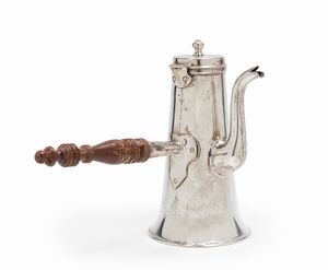 in argento, Peso g 550,00 cm 24,00 XIX Secolo manico in legno, poggiante su tre piedini, decoro in stile Impero [..]