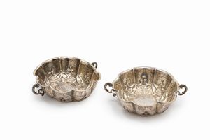 in argento, Peso g 470,00 cm 5,50x13,00-10,00x13,00 XIX Secolo di forma rotonda, con decoro floreale sbalzati, [..]