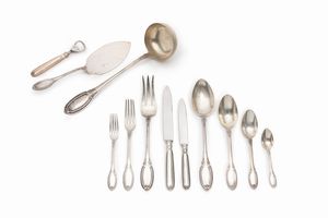 in argento, Peso kg 4,920 (servizio di posate) - kg 0,700 (set di coltelli e apribottiglie al netto delle lame) [..]