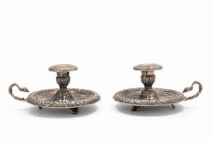 in argento, Peso g 540,00 cm 19,00x10,00 XX Secolo poggianti su tre piedini, con decori floreali sbalzati.