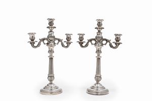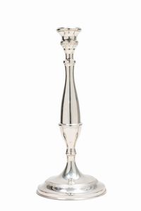 in argento, Peso g 390,00 (compresa zavorra) h cm 27,50 Italia, XX secolo a fusto liscio con decoro in stile [..]