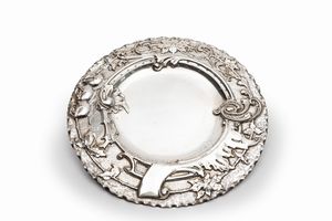 in argento, Peso g 960,00 cm 45,00 XX Secolo di forma rotonda con decoro vegetale realizzato a sbalzo.