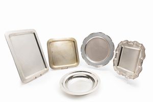 in argento, Peso kg 4,870 cm 29,00-30,00-35,50-31,00x43,00-32,50x32,50 Italia, XX secolo composto da tre piatti [..]