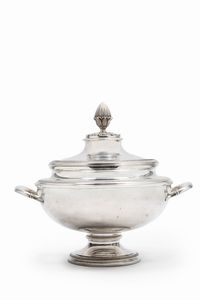 in argento, Peso kg 1,250 cm 31,00x24,00x31,00 Italia, XX secolo con decoro in stile Impero e presa a pigna.