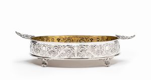 in argento, Peso g 740,00 cm 18,50x34,00 Italia, XX secolo con manici e decoro floreale, interno in vermeil.