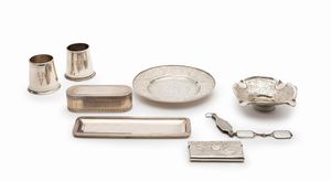 in argento, Peso g 660,00 XX Secolo composto da un piattino, un portapenne, una scatola, due bicchierini, un [..]