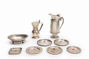 in argento, Peso kg 1,400 h cm 11,00-22,00 Italia, XX Secolo composto da 1 caraffa, 1 piccolo versatoio, 6 piattini [..]