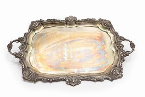 in argento, Peso kg 5,400 cm 85,00x55,00 Italia, XX Secolo a due manici con profilo a volute.