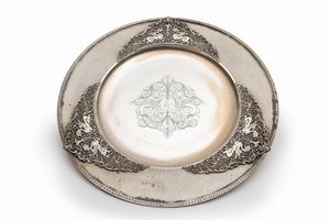 in argento, Peso kg 1,650 cm 38,00 Italia, XX Secolo di forma rotonda con tre motivi traforati e applicati, al [..]