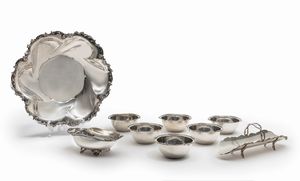 in argento, Peso kg 1,939 cm 33,00-26,50-19,00-12,00 Italia, XX Secolo composto da un centrotavola, una formaggiera [..]