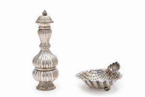 in argento, Peso lordo g 925,00 (comprensivo degli inserti metallici del macinino) Italia, XX Secolo composto [..]