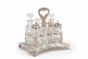 in argento, Peso g 843,00 (al netto dei cristalli) cm 18,00x24,00x23,00 Londra, 1836 base rettangolare mossa [..]