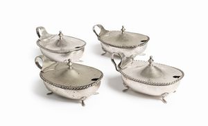 in argento, Peso kg 1,000 cm 16,00x9,50x7,50 (al netto dei vetri) Italia, XX secolo di forma ovale, poggianti [..]