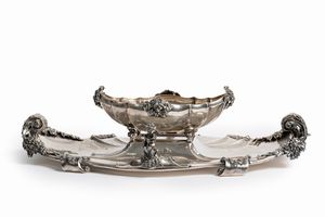 in argento, Peso kg 5,128 cm 38,50x64,50x17,00 Italia, XX secolo di forma ovale, piedi a ricciolo, decori a grappoli [..]