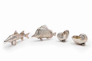 in argento 800 e 925, Peso kg 1,570 cm 28,00-35,00-h 11,00 Italia, XX Secolo due pesci snodati firmati Cusi e [..]