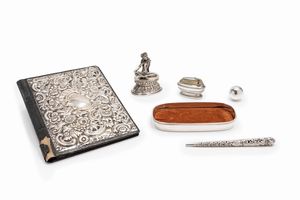 in argento e metallo argentato, Peso kg 2,320 (comprensivi di tutti gli inserti non in argento) un porta documenti, [..]