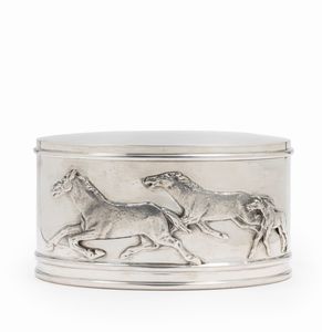 in argento, Peso g 840,00 cm 18,00x11,50x9,00 Italia, XX secolo di forma ovale con cavalli applicati e [..]