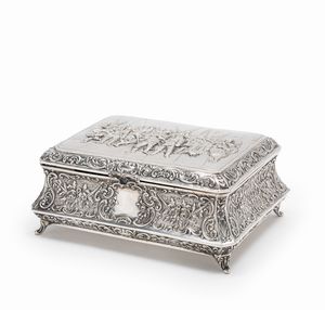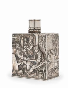 in argento, Peso g 183,00 cm 8,50x5,00x12,00 Olanda, XVIII secolo di forma rettangolare con scene di vita quotidiana [..]