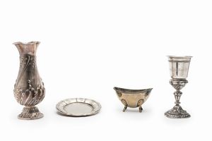 in argento, Peso g 891,70 h cm 25,00-8,50x14,00-17,00-20,00 XX Secolo composto da un vaso, un calice, un piattino [..]