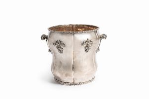 in argento, Peso kg 1,917 cm 20,50x23,00 Italia, XX secolo decorato da motivi a foglie, frutti e volute, manici [..]