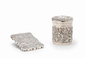 in argento, Peso g 155,70 cm 6,50x8,00-7,00x10,00 Inghilterra, inizio XX Secolo con decoro floreale inciso e [..]