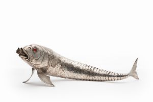 in argento, Peso g 425,00 cm 13,00x43,00 XX secolo a forma di pesce con corpo snodato e occhi in pietra dura [..]