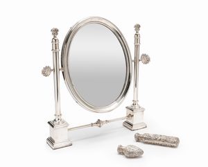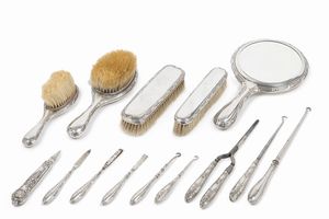 in argento, Peso kg 1,900 (comprensivo dello specchio, delle setole e degli inserti in legno e metallo) XX Secolo [..]