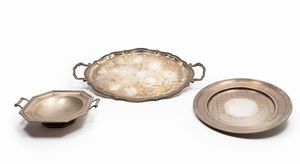 in argento, Peso kg 2,085 cm 20,50x20,50-30,00x30,00-32,50x52,00 Italia, XX secolo un'alzatina, un piatto ed [..]