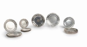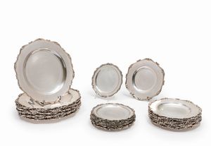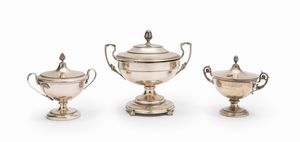 in argento, Peso g 623,40 cm 20,00 Italia, XX Secolo corpo liscio, bordo stile Impero, due recano al centro stemma [..]