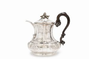 in argento, Peso g 800,00 h cm 24,00 Italia, XX Secolo manico in legno, ricco decoro floreale inciso, reca punzone [..]