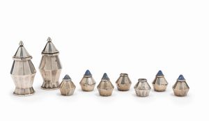 in argento, Peso kg 2,831 cm 16,00-22,00-23,50x30,50-15,00 Italia, XX Secolo composto da due cestini e undici [..]