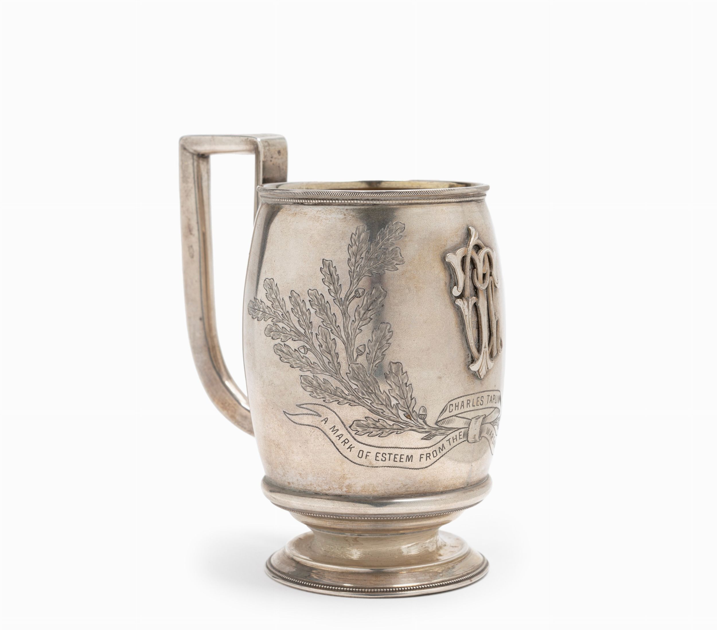 Mosca, fine XIX Secolo con interno in vermeil, iniziali in rilievo e decoro con foglie di quercia e ghianda.