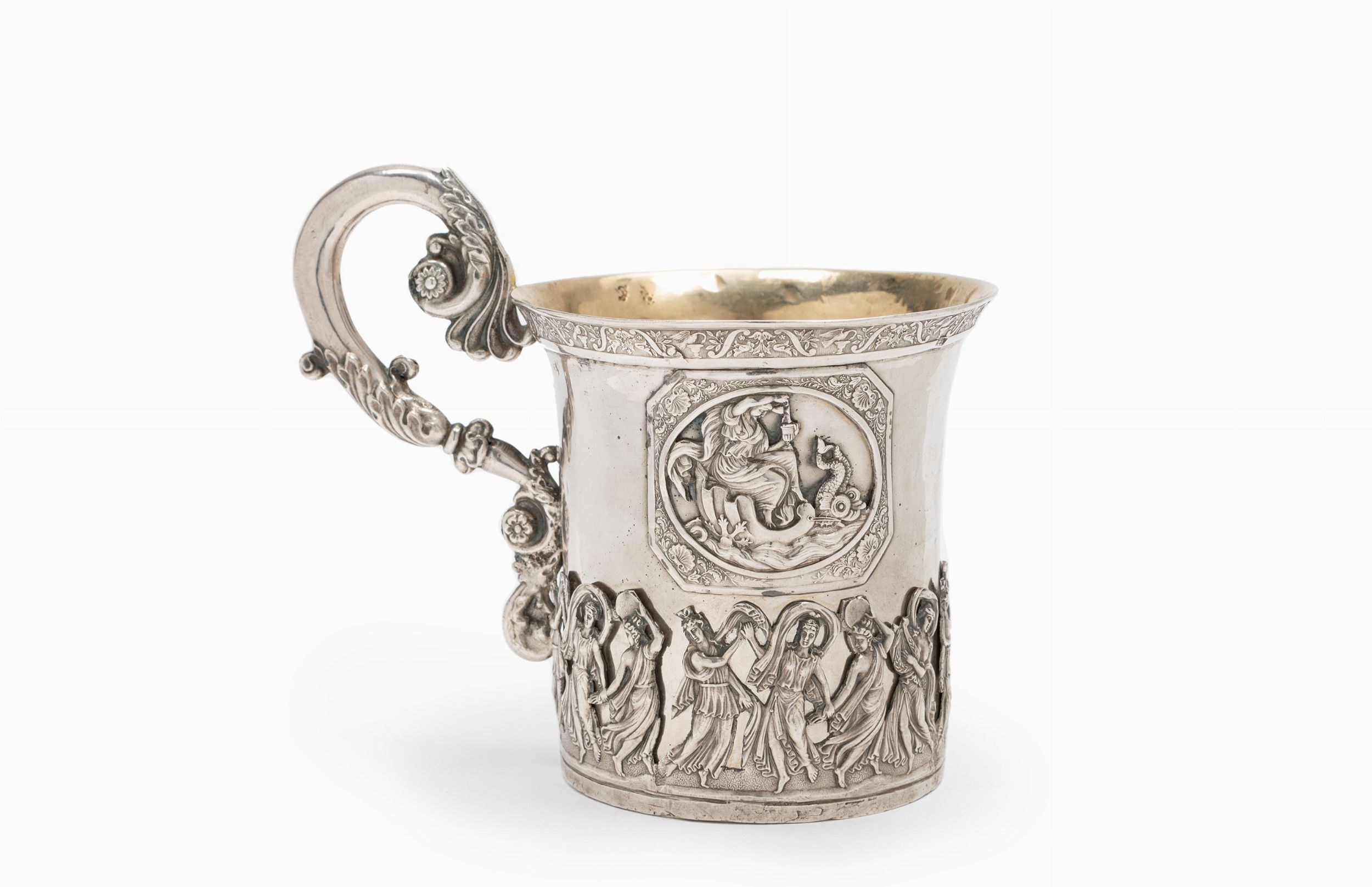 Mosca, metà XIX Secolo con interno in vermeil, manico sagomato, decorazioni applicate raffiguranti muse festanti e la Nereide Galatea, difetti (ammaccature e graffi alla base).