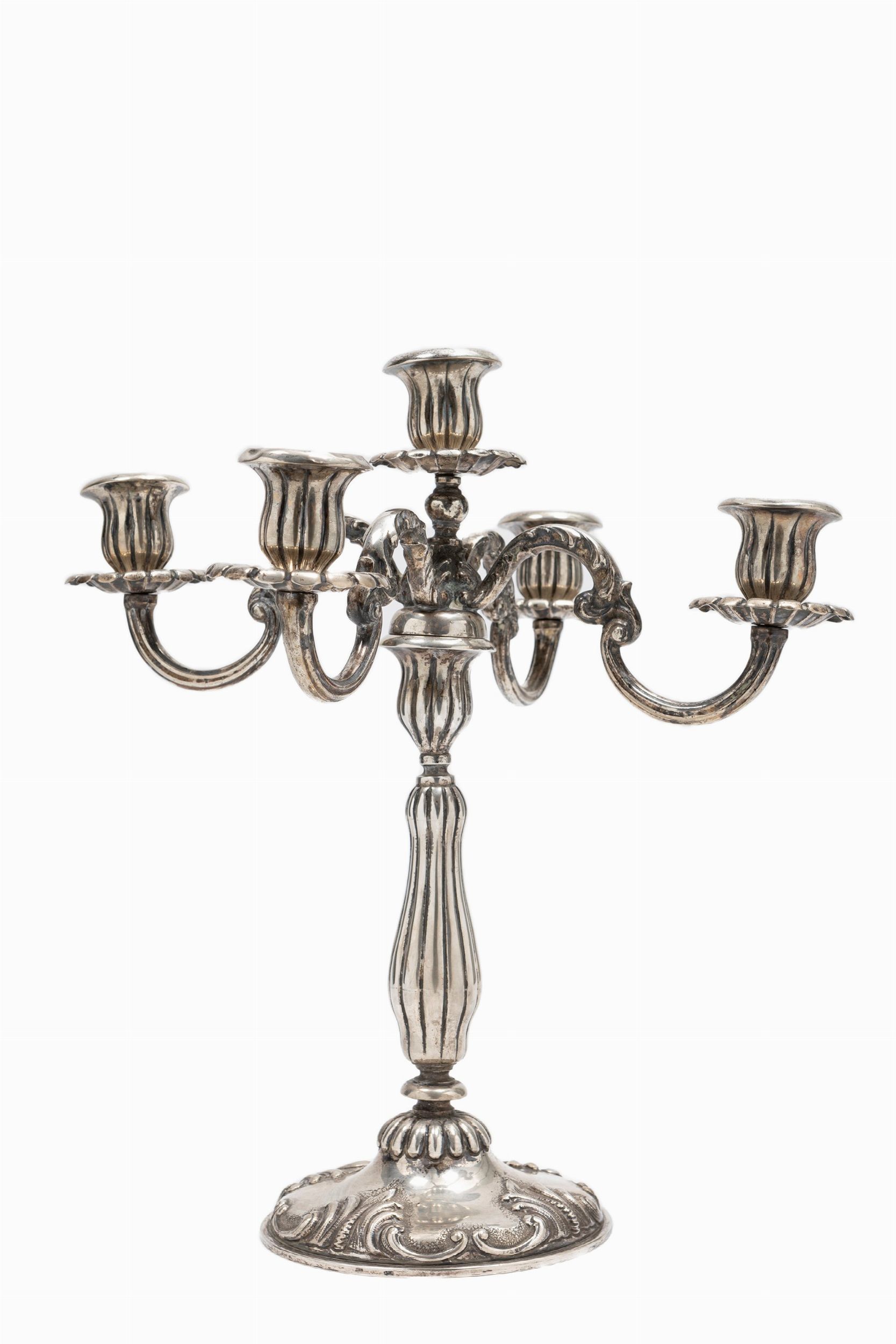 XX Secolo a cinque fiamme, base rotonda, con decoro sbalzato, fusto affusolato e inciso.