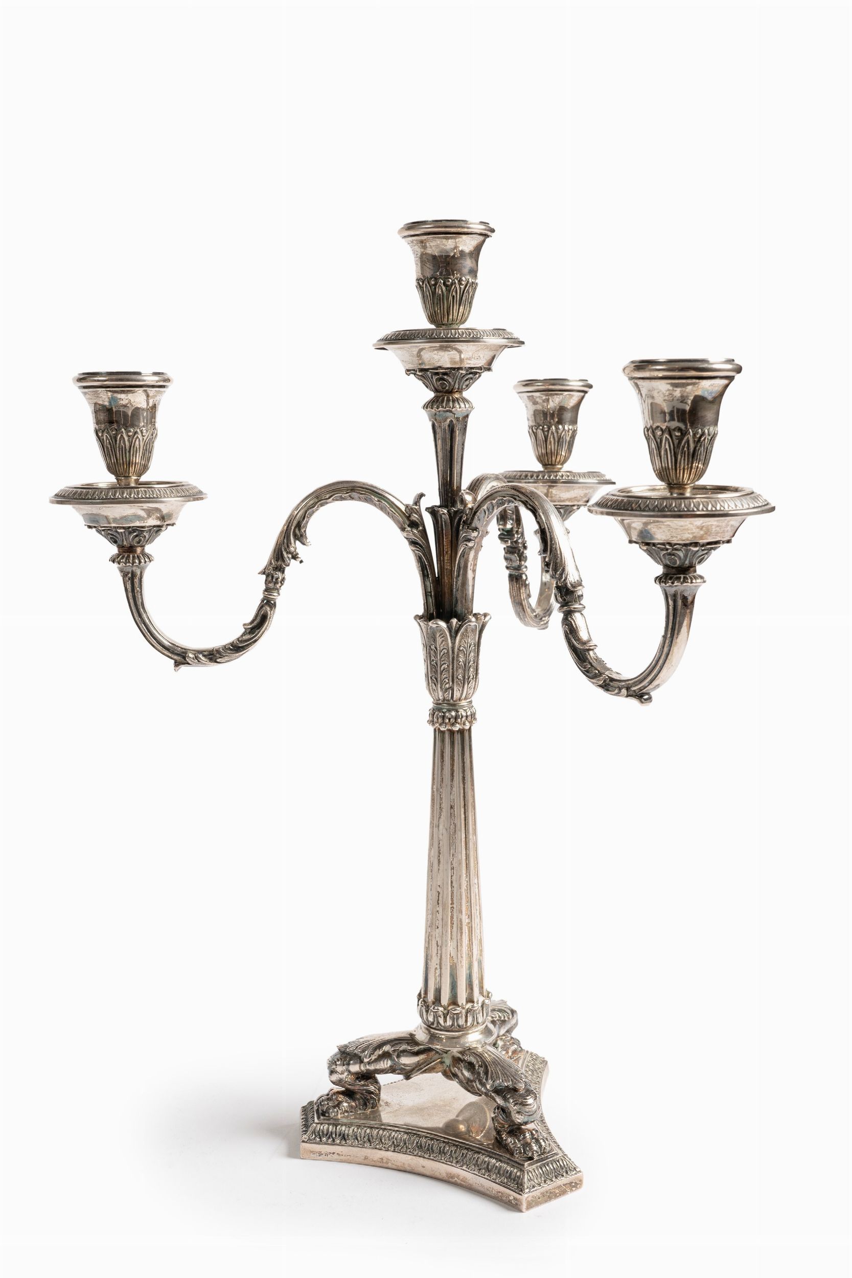 Italia, XX secolo a quattro fiamme, base con piedini zoomorfi, fusto scanalato e decoro in stile impero.